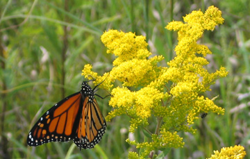 September 5--During an afternoon visit to Neal Smith National Wildlife Refuge, an interesting change was occurring in the monarchs' nectaring pattern. For the first time this fall, numbers of the monarchs were seeking out goldenrod flowers for their nectaring. Others were continuing to stop on the tickseed sunflowers and an occasional thistle. The count during a visit of an hour and 45 minutes was 154 monarchs.