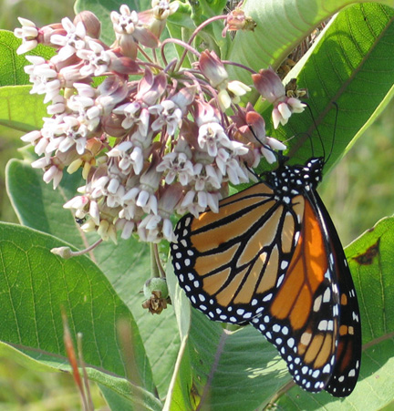 A monarch stops on a milkweed in late August.