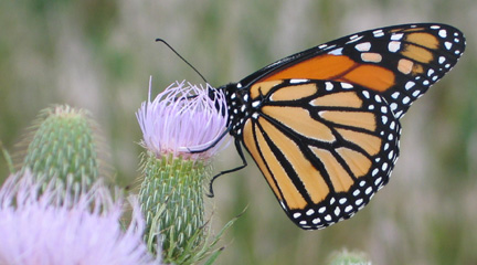 August 30--Sixty-seven monarch butterflies were noted at Neal Smith National Wildlife Refuge during a visit of one and one-half hours in the morning. Many were spotted on the northern edge of the refuge, suggesting they were part of the early movement of monarchs beginning their migration to the south. They often were seen coming up out of the big bluestem grasses where they likely were staying overnight. Field observations at the refuge during the summer months did not reflect as much monarch activity in this northern area.