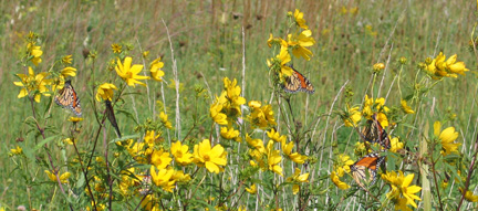 September 20--Just when it appeared their migration activity over central Iowa was about to end, the monarch butterflies put on a spectacular show at Neal Smith National Wildlife Refuge. In a bit more than three hours of observation, 432 monarchs were counted as they moved to and fro over sawtooth sunflowers, nectared on native New England purple asters, and stopped on an occasional thistle. The appearance of so many monarchs indicated their capability to survive the rainy days and cold weather that has hit central Iowa in recent days. This morning, counties to the north reported temperatures in the mid-30 degrees, and central Iowa started the day in the low 40s. Many of the monarchs at Neal Smith appeared to have been hiding in the safety of the tall big bluestem grasses. As the day warmed up around the noon hour, the monarchs came up out of the grasses and were on the move. Two days ago, only two monarchs were seen in more than two hours.