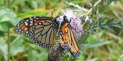 September 1--Monarch activity at Neal Smith National Wildlife Refuge continued to increase as 155 monarchs were observed in a bit more than two hours. The most popular nectaring flowers were tickseed sunflowers and common thistles. Numerous monarchs were found in a large stand of tickseeds where the butterflies were flying to and fro as they moved from flower to flower. Often two or more monarchs were chasing each other in the air above.