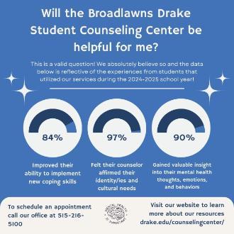 The Drake University Student Counseling Center, located inside Broadlawns Community Clinic at Drake, seeks to compassionately address mental health concerns and provide valuable self-care tools to improve your overall well-being, meeting all student needs regardless.