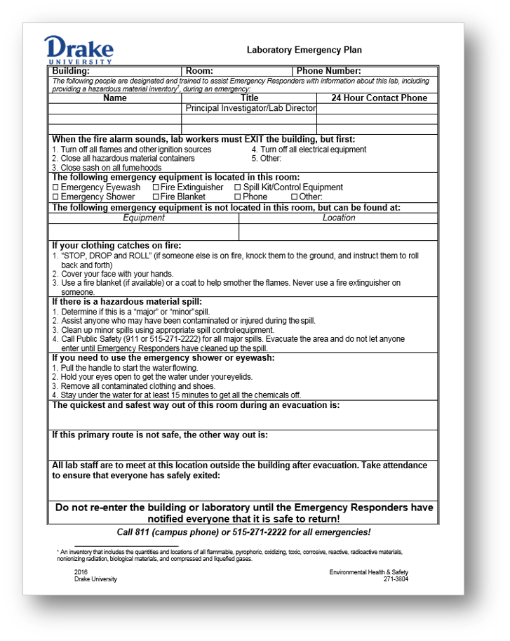 Principal investigators or laboratory supervisors must develop an emergency action plan for their labs and all employees must be trained on the location and contents of the plan. The emergency action plan should provide contact information as well as the specific steps to be taken in an emergency. To simplify the process, EH&S has created an emergency action plan template, which can be found on the EH&S website. Information specific to your laboratory will need to be added to the template and the plan should be posted near the exit of the laboratory for easy retrieval during an incident. Remember to update the contact information, as needed.