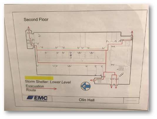 Emergency MapsEmergency maps should be present in the corridors of all campus buildings. Familiarize yourself with evacuation routes, severe weather shelter locations, and emergency equipment locations before an emergency arises.