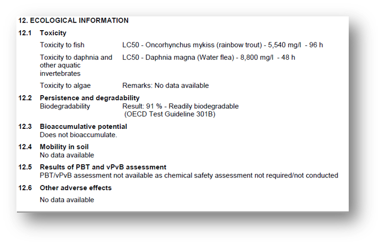 Section 12, Ecological information, describes the ecotoxicity, persistence, degradability, mobility in soil, and other adverse effects of the chemical.
