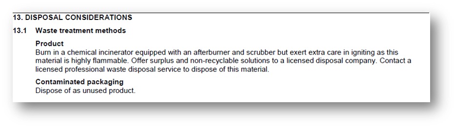 Section 13 provides a description of waste residues and information on their safe handling methods of disposal.