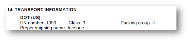 Section 14 lists special precautions which a user needs to be aware of or needs to comply with in connection with transport of the material.
