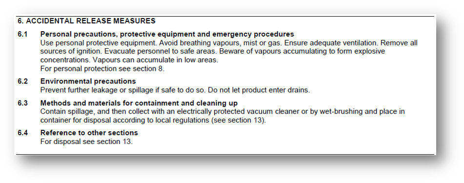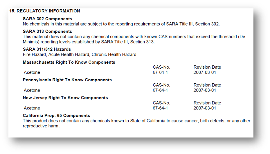 Section 15 will reference safety, health and environmental regulations specific for the product in question.