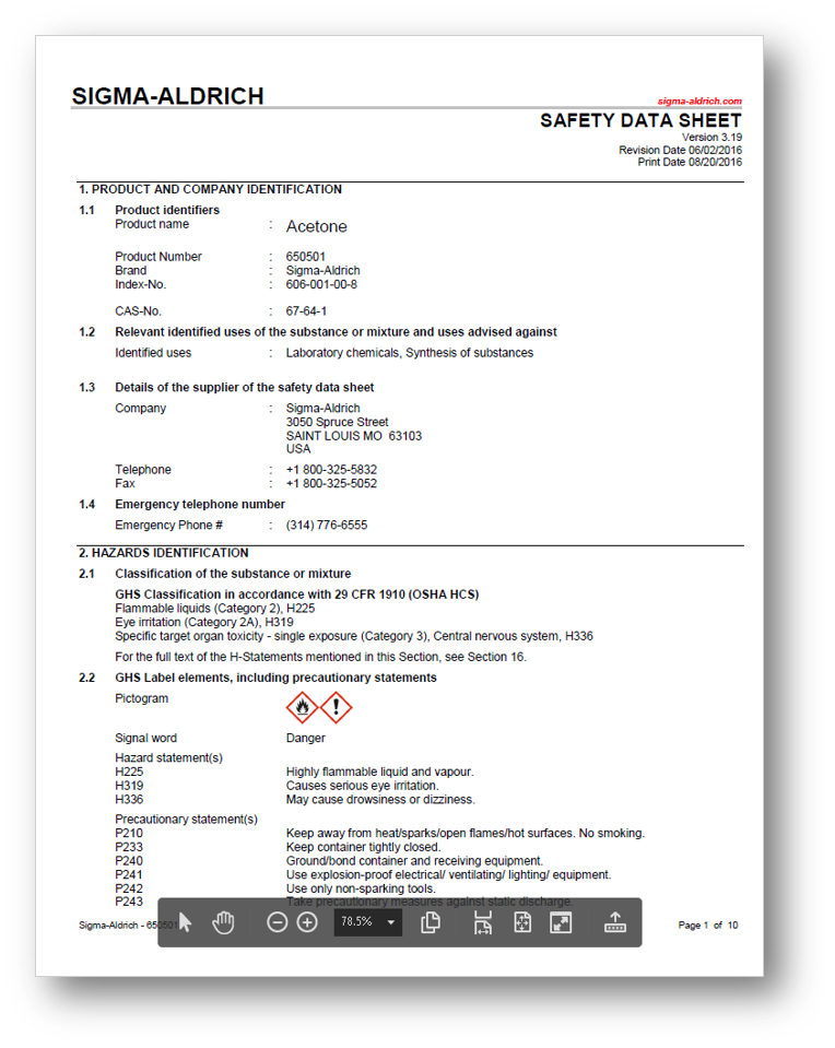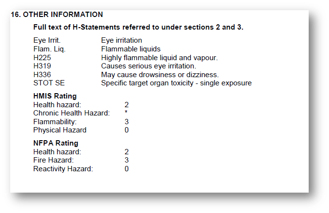 Each safety data sheet will contain 16 standardized sections. Each of the 16 sections are covered below.