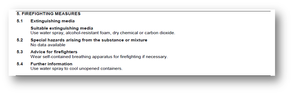 Section 5 lists suitable extinguishing techniques and equipment, as well as chemical hazards from fire.
