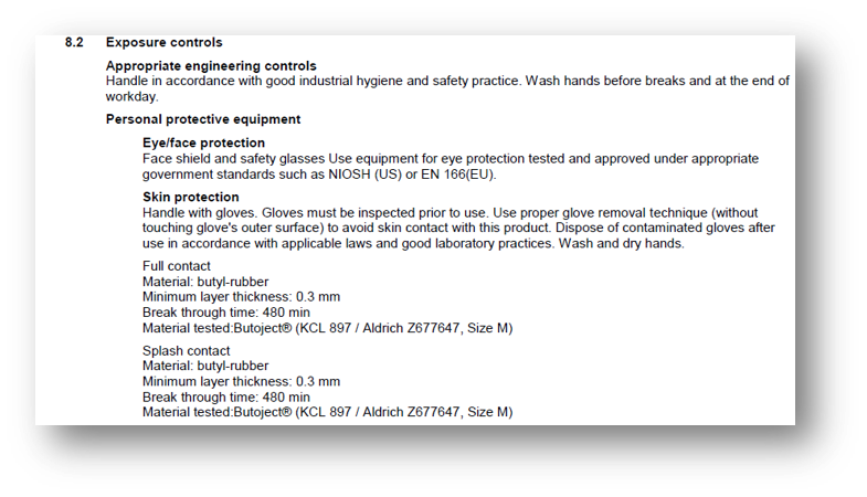 Section 8 lists published exposure limits (i.e., PEL, TLV), appropriate engineering controls and personal protective equipment necessary to avoid exposure.
