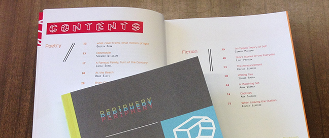 Periphery is Drake’s art and literary journal, published annually in sprig. It is sponsored and funded by the Student Activities Board (SAB), and edited and staffed entirely by students (there is a faculty adviser). All Drake students are welcome to submit poetry, fiction, essays, or art for consideration. Calls for submission will be posted here, on walls around campus, and via email. The editors recruit guest judges—usually professional writers not associated with Drake—to review final copy and award prizes for poetry, fiction, and art.