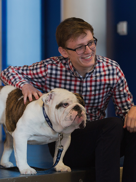 He’s a certified therapy dog who has found his life’s calling—being the walking, wiggling embodiment of smart, dedicated, fun-loving, enthusiastic, big-hearted, loyal Drake Bulldogs everywhere.