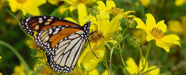 Migrating Monarch Butterfly Feeds From Tickseed Sunflowers September 2--During a morning visit, more than 200 monarchs were observed flying to and fro through the Neal Smith wildlife refuge. They were feeding on the flowers, primarily the tickseed sunflowers and thistles. It's interesting to note that in areas where goldenrod grows--but the other afore-mentioned flowers do not--the monarchs will feed on the goldenrod. But at this refuge, the stands of goldenrod appear to be ignored when the monarchs have a choice of other flowers--especially the tickseed sunflowers. Back home in our butterfly garden in Altoona, Iowa, 10 or more monarchs were observed on this day flying in and out of the garden and feeding on the flowers--with the primary favorite here being the prairie (purple) coneflowers. The native purple asters--a primary attraction for the monarchs--have yet to bloom. September 3--Another great day for monarch watching. The highlight came late in the afternoon--from 4:15 p.m. to 5:15 p.m.--when 302 migrating monarchs were counted in the air during the single hour. The wind was blowing from the northeast, and the monarchs were essentially riding the wind--especially when they were flying or floating at 1,000 feet or above. The counting was done near our butterfly garden in Altoona, Iowa. The garden is just a few blocks from the open prairie to the north, and the monarchs appeared as singles and in groups of two or three as they flew over at heights from 5 feet to more than 1,000 feet. Later, at least 30 monarchs were feeding at various places in our butterfly garden. A return visit to the Neal Smith National Wildlife Refuge earlier in the day turned up substantial monarch activity, but the overall numbers appeared to be down from the three previous days. |