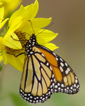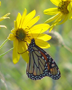 September 14, 2002--Saturday was another great day for monarch watching. Upon arrival at Neal Smith NationalWildlife Refuge at 8:45 a.m., I noted groups of monarchs appeared to be roosting on several of the tallest Jerusalem artichokes. A light rain had been falling earlier in the morning, and the monarchs were clustered at the tops of Jerusalem artichokes and down in the tall big bluestem grasses. As the sun came out from time to time from under the clouds, the monarchs could be seen sunning their wings and opening and closing them. During the morning, there was continual monarch movement in the refuge, and in 3 1/2 hours, at least 415 monarchs were observed. At one point late in the morning, the wind shifted from the south southeast to the northwest, and the breeze brought a flurry of monarchs racing across the prairie for several minutes. September 15, 2002--The day was clear and cool, and the number of monarchs appeared to be down from the past two days. During two hours at Neal Smith National Wildlife Refuge, 37 monarchs were counted between 8:15 a.m. and 10:15 a.m. No monarchs were seen along the roadways during the drive to and from the refuge. A single monarch was seen passing through our butterfly garden later. September 16, 2002--Monarchs were on the move in the morning across the Drake University campus and roadways of central Iowa. A friend reported having seen a number of monarchs around Saylorville Lake north of Des Moines on Sunday. September 17, 2002--Seventy-five monarchs were observed from 1 p.m. to 3 p.m. in the Neal Smith National Wildlife Refuge. The monarchs were struggling against a strong breeze from the southeast and appeared to be nectaring exclusively on the Jerusalem artichokes. They were clinging to the flowers as the plants swayed in the wind. Elsewhere across central Iowa , I saw at least 15 more monarchs during the day. September 19, 2002--Following the passage of another cold front and a cool rain, this was another great day for observing the monarch migration at Neal Smith National Wildlife Refuge. From 3:45 p.m. to 6 p.m., 225 monarchs were observed flying across the prairie and feeding on the flowers. Particularly interesting was the fact that the native purple asters were in full bloom, and the monarchs were making the flowers a favored feeding place. September 20, 2002--The monarchs were on the move again. A wind from the west stirred up the monarch movements, and in an hour, I counted more than 80 monarchs flying, floating, and speeding on the wind to the east southeast across the prairie at Neal Smith National Wildlife Refuge. After observing the passage of the monarchs at a specific point in the northern part of the refuge, I then sought out feeding areas. Overall, in three hours from 10:50 a.m. to 1:50 p.m., 252 monarchs were counted during the observations. September 21, 2002--How quickly things change during the monarch migratory season. On this day during a one-hour visit from 1:15 p.m. to 2:15 p.m. at Neal Smith National Wildlife Refuge, I observed only a single monarch flying across the prairie after several days of seeing many in the same environment. September 22, 2002--No migrating monarchs were observed throughout the day.
