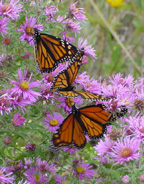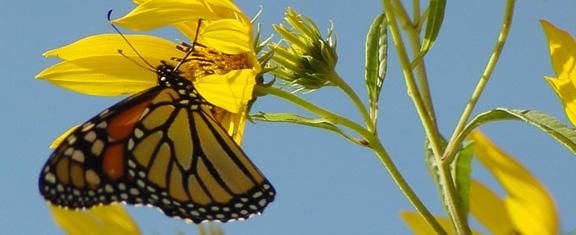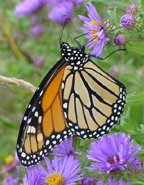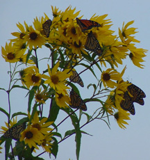 September 7,2002--A Saturday morning visit to Neal Smith National Wildlife Refuge turned up 65 monarchs in 1 1/2 hours. The monarch activity was heavier than in recent days but still did not measure up to the totals being seen last autumn. Tickseed sunflowers and thistles continued to serve as the main feeding stations. Later in the morning, a 20-mile drive along secondary roads in Iowa turned up a single monarch crossing the roadway. Normally, at this time of year, the migrating monarchs are regularly seen along the state's roadways. Back in our butterfly garden in Altoona, Iowa, the first native asters are beginning to bloom. The initial blooms often coincide with an increase in the number of monarchs passing through and/or stopping for an overnight stay in the butterfly garden. This year, the activity has been minimal so far. September 8, 2002--An hour visit to Neal Smith National Wildlife Refuge in the late morning turned up 23 monarch butterflies feeding on thistles and tickseed sunflowers. September 9, 2002--The weather in central Iowa continued to be unseasonably warm with a high of 90 degrees in Des Moines. But a cold front was moving in from the northwest, and by Tuesday, the weather should be changing. Will the front bring more migrating monarchs with it? September 10, 2002--A wonderful day. The cold front was passing through the state, and by late afternoon, migrating monarchs were riding and floating on the wind on their southward journey. In 45 minutes--from 5:15 p.m. to 6 p.m.--150 monarchs were counted high in the sky flying over our butterfly garden in Altoona, Iowa. They came so fast at times that the count certainly was conservative. Some of the monarchs could be seen with the naked eye, but this was a day when binoculars were needed to experience the magnitude of the event. On the drive home from the Drake University campus, I observed at least 15 monarchs--many crossing the roadways where none had been seen for days. In our monarch garden, monarchs could be seen flying over the autumn flowers at the end of the day. September 11, 2002--The cold front earlier this week definitely stepped up the pace of the monarch migration through central Iowa. Monarchs could be seen throughout the day migrating across the campus of Drake University in Des Moines. During a visit to Neal Smith National Wildlife Refuge, I observed at least 125 monarchs during a 2 1/2-hour visit in the late afternoon. A highlight was watching 25 to 30 monarchs nectaring on a large stand of Jerusalem artichokes. Some of the plants are now more than 10 feet tall, and the monarchs were flying around the flowers and feeding, their outlines making a beautiful picture against the autumn sky. The silence and solitude of the surroundings fit well with the day of national remembrance concerning the 9/11 tragedy. |