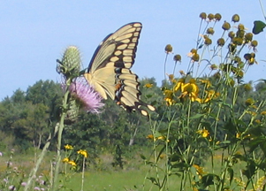 September 3--The number of migrating monarchs continued to increase at Neal Smith National Wildlife Refuge. Many more could be seen flying into the refuge from the north. The monarchs also were actively nectaring in a stand of tickseed sunflowers and along a savanna trail to the south. In two hours of observing, 246 monarchs were counted. The prairie also is alive with the activity of varieties of swallowtail butterflies, migrating dragonflies, and the ever-present sounds of goldfinches enjoying their harvest from the thistle tops. For two successsive days, giant swallowtails have been noted along the savanna trail, and they provide another special sight on the prairie scene.