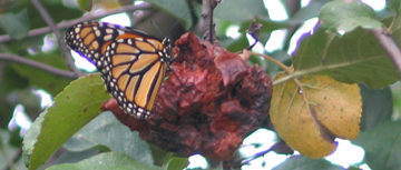 A monarch rests on a dried-out Northern Spy apple in the butterfly garden.