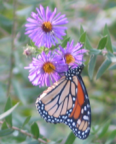 September 21--The purple asters, a favorite of migrating monarchs, are blooming now at Neal Smith National Wlldlife Refuge and in our butterfly garden in Altoona. As the days go by, more monarchs can be seen nectaring on the asters. Today was one of those days in our front garden, when monarchs could be seen circling the asters and stopping for the nectar.