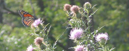 September 2--On this day, migrating monarchs could be found along a savanna trail in Neal Smith National Wildlife Refuge. The trail sits on the edge of a wooded area that opens out onto the prairie filled with wildflowers and grasses. Monarchs were not readily apparent in the northern part of the refuge during a morning visit, but a walk along the savanna trail showed where the butterflies could be found. Several were flying out of the trees and onto the prairie for nectaring. Others were feeding on thistles adjoining the trail. In all, 83 monarchs were counted in an hour and one-half.