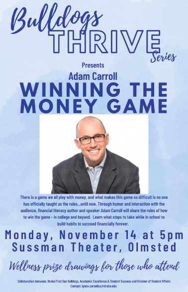 Bulldogs Thrive Series presents Adam Carroll Winning The Money Game. There is a game we all play with money, and what makes this game so difficult is no one has officaially taught us the rules......until now. Through humor and interaction with the audience, financial literacy author and speaker Adam Carroll will share the rules of how to win the game - in college and beyond.