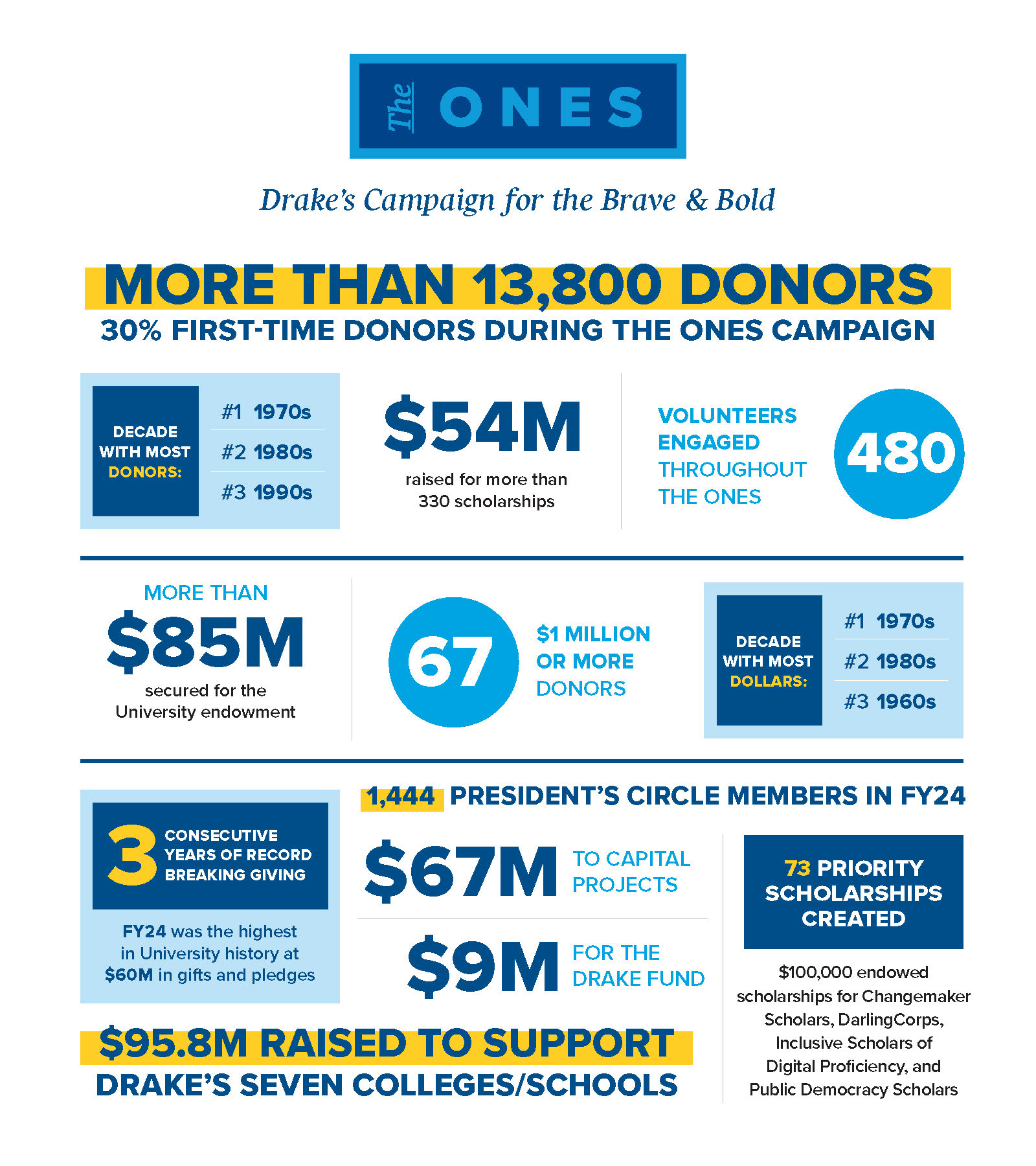 To learn more about the campaign, visit https://theones.drake.edu/historic-results.html
