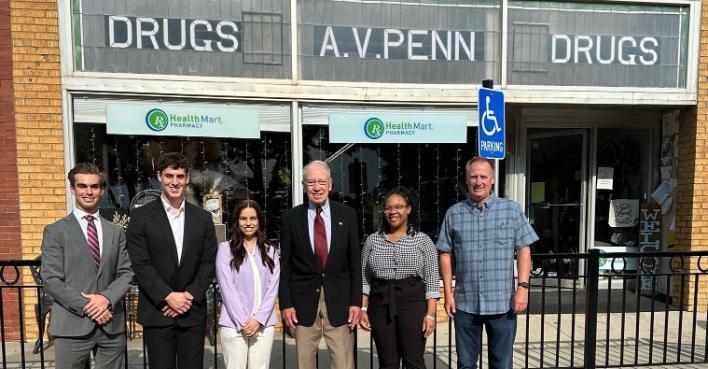 Photo: Kaitlyn Thomas pictured with U.S. Senator Chuck Grassley, staff from Bedford Drug and Penn Drug Company, and IPA staff where the group discussed access to healthcare, provider status legislation, PBM efforts at the state and federal levels, and the DIR cliff.