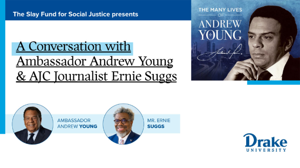 Come join us at Drake University for an evening of civil rights history and social justice featuring Ambassador Andrew Young and Atlanta Journal-Constitution journalist Ernie Suggs. This special event, held on Monday, February 26 at 7:00pm, will offer an in-person presentation complementing the 'Many Lives of Andrew Young' exhibit featured at Drake University during Black History Month. The event, free and open to all Drake students, faculty, and staff and the general public, will begin at 7:00pm in Olmsted Center (Parents Hall, upper level) and will also be live-streamed and can be accessed through https://live.drake.edu/.