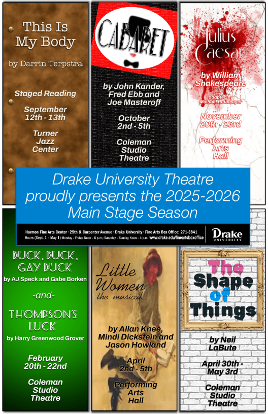 For tickets to Drake Theatre productions, click here. Contact the Fine Arts Box Office at boxoffice@drake.edu or call 515-271-3841.